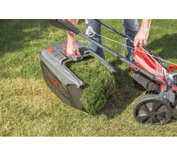 - Зрізана трава потрапляє через надвисокий корпус із листової сталі за технологією MaxAirflow в 70-літровий травозбірник з індикатором рівня заповнення, та вказує, чи він заповнений до верху, і тому його слід рідше спорожняти.