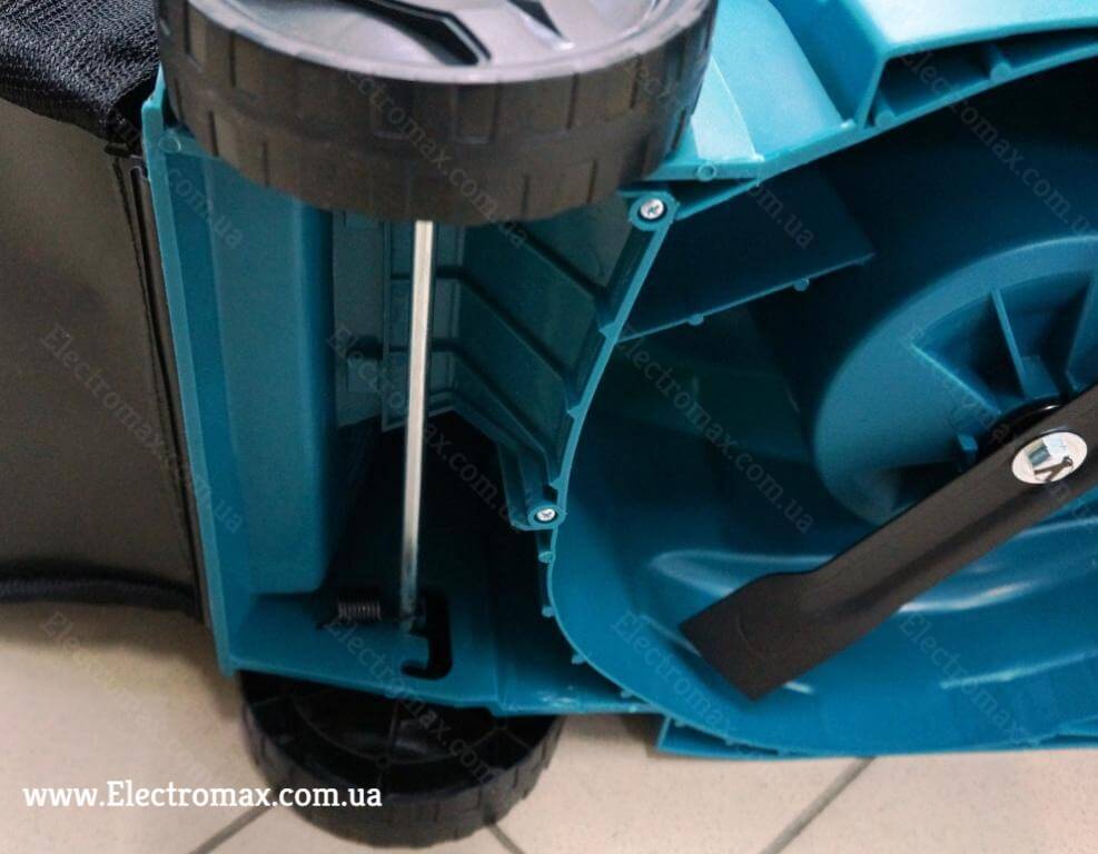 По-друге Зручність регулювання висоти: знадобиться всього 10 секунд для зміна висоти косіння, дуже простий механізм з пружинами, в той час як аналоги часто роблять метод кріплення коліс за допомогою шурупів (коли кожне колесо вкручується в своє гніздо, для зміни висоти доводиться відкручувати і закручувати кожне колесо)